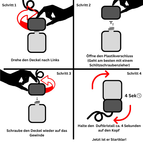 Achtung: Duftkristalle sind ausschließlich zur Raumbeduftung geeignet. Nicht verschlucken, nicht in Kontakt mit Haut oder Augen bringen.